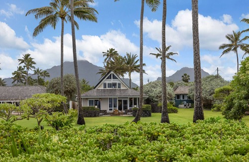 welcome to "kailua kai" - island living at its finest This is a beautiful, yet casual beachfront home located on the Windward side of Oahu, 30 minutes from Honolulu and approximately 1 mile from the center of Kailua Town. Enjoy spectacular sunrises over Kailua Bay, the scenic Ko'olau Mountain Range and outlying islands right from the front lanai. The home enjoys cool breezes that come off the ocean, a large open floor plan, spacious guest rooms and an expansive ocean front, manicured lawn with swaying palm trees and the ocean beyond. Guests can enjoy swimming, body surfing, paddling and fishing right from the backyard! The kitchen is fully equipped with everything needed for a culinary feast, or Kailua Town is just a 5 minute drive with its' myriad of restaurants to choose from.