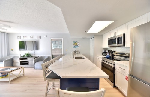 inside, you’ll find a bright, coastal-inspired living space with comfortable seating, ceiling fans, and plenty of natural light The living room and both bedrooms each feature their own Smart TVs with 150+ popular cable channels including HBO Max, plus access to your favorite streaming apps. Guests also enjoy high-speed wireless internet up to 600 Mbps, perfect for streaming, remote work, and video calls. The fully equipped kitchen includes new stainless-steel appliances, a spacious breakfast bar, and a combination Keurig-style and drip-style coffee maker. To make your stay even more enjoyable, we include complimentary coffee for the first few days so you can settle in and start your mornings island-style.