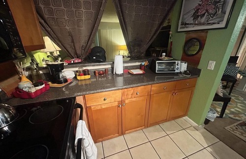 This nonsmokers-only property is my private, full-time home which I bought in 2021. It's available for private use when I'm traveling on business. This quiet, attractively decorated and furnished 1/1 condo is 760 sf. and on the first floor. It's nestled in a shady forest 1.6 mi. north of UF, and the complex even has a creek and wooden bridge! It has wifi and a smart TV in the living room with the most popular apps for watching YouTube, free movies, and news. Enjoy the semi-firm king bed, well-appointed kitchen, dining area, living room with classic art, and tropical back garden. The bathroom has a tub and shower. A pool with grills, clubhouse for work/study and free WiFi, and fitness center with saunas are for your use. Parking is free and unassigned, so park in any space although I recommend near the street so you can easily back out. The home is filled with classical art, yet the bedroom is contemporary and modern. Enjoy the condo as your home-away-from-home with its fully equipped kitchen containing dishes, pots, pans, cups, glasses, coffee maker, tea kettle, blender, toaster, toaster oven, utensils, spices, and other items needed for storing, preparing, and eating meals. The complex is in a forest with views of magnolias, ferns, bamboo, and other tropical vegetation. Forested Ring Park is across the street for tranquil nature trail walks along the creek. Many springs and spring-fed rivers are located nearby in famous Florida state parks for nature outings which this area is famous for. Note: All guests (2 maximum) must be 19 years old or over. No children, pets, or smokers, please.