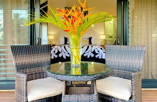 the bedrooms are an open studio style layout with reading lights above a super king split bed, clothes rack, flat screen television for your own entertainment In addition, the villa features a small kitchenette, a private en-suite with a shower & fresh linen, vanity & toilet and a spacious semi-covered wooden deck area with an outside dining table for two to enjoy the outdoors and spacious parking for a rental car.