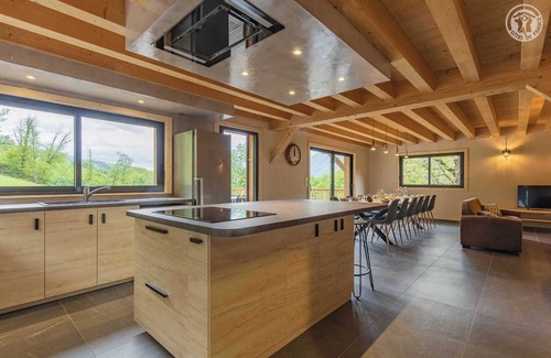 Detached house on 2 levels, including the workshop of the artisan owner in the basement. Ground floor: living room-kitchen with lounge area, wood stove, 1 bedroom with terrace (1 double bed 160x200 cm), a bathroom (shower, 2 basins and WC), separate WC (washbasin) , laundry. 1st floor: 3 bedrooms with balcony (3 single beds 90x190cm including 2 that can be combined into 1 double bed / 3 single beds 90x190cm including 2 that can be combined into 1 double bed / 2 single beds 90x190cm that can be combined into 1 double bed ), a living room, a bathroom (shower and 2 sinks), separate WC. Terrace. Wooded lot. Private parking for 3/4 cars. Wooden frame house, located 50 m from the owners' house, in a hamlet. Wooded land with a chicken coop, a goat and a goat in a fenced area. Spacious cottage with a bright living room opening onto a 50 m² terrace with a very clear view of the valley and the surrounding mountains. Upstairs living room with games for children. Ecological construction with solar panels, VMC double flow..