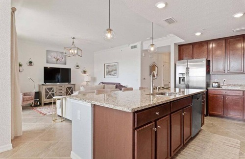 as you enter this pristine oasis, you will find an open floor plan showcasing a modern, updated kitchen, dining area and great room The great room showcases large modern, luxurious couches and a huge flat-screen TV to catch up on your favorite movie. This flowing floor plan allows ample room to convene with friends and family after a long, fun day at the beach. The dining area offers a magnificent chandelier, and a modern, dining room table with comfortable chairs and seating for four, where everyone can gather for a meal. If you're in the mood for a quick bite, grab a seat on one of the counter stools of the kitchen island. This modern kitchen boasts wooden cabinetry, granite countertops, a large island & top-of-the-line stainless-steel appliances, including a refrigerator, oven, microwave, & a dishwasher.