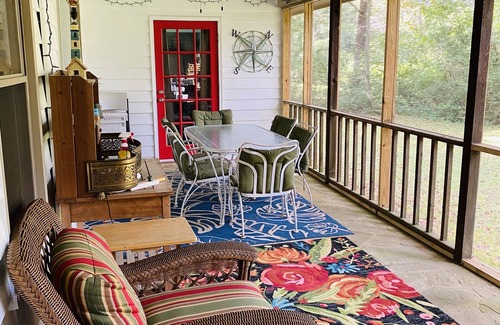 One story mountaintop bungalow sits on two acres and is perfect for a family vacation, girl's retreat or home base when attending a Lodge or Burritt wedding. Those interested in Huntsville's space history will find this house and the story it tells fascinating. With the wonder of nature right outside your back door, you are able to walk or ride a bike to the state park with its beautiful hiking trails and you are still only minutes away from the Medical District, 5 Points and the Space and Rocket Center. If you head west you are only 5 miles from the Robert Trent Jones golf course and Hampton Cove. This fully furnished home has a king bed in the master bedroom with a huge walk in closet (which has a youth bed in it), a queen bed in the second bedroom, and two twins or a king in the library. There are also two foldaway beds, 3 camp cots and a baby bed if needed. The house has two full bathrooms; one with a tub shower, and the other with a walk in shower. There are two steps down (with handicap handrail) from the living room to the bedrooms. There is plenty of closet space, a full sized washer and dryer, iron and ironing board, cookware, dishes and utensils, a dining table that will seat 10, a well stocked library and a gorgeous fireplace to sit and enjoy yourself for as long as you like. TV, high speed wireless internet, outdoor fire pit grill, screened porch, pool table, and many more amenities are provided. This lovely home is filled with beautiful antiques, oriental carpets and all the extras to make you feel right at home. The hosts live next door and can help with any particular needs you might have. No pets allowed, but we have 2 dogs you can borrow if you need a hug!.