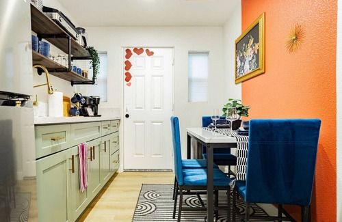 Embark on your Vegas journey in not one, but TWO 1-bed apartment units, combined into a versatile 2-bed, 2-bath retreat, ideal for groups of up to 12! Enjoy peaceful nights in our cozy bedrooms, or relax in either living room, playing Skeeball or Shuffleboard, and cook up gourmet delights in our well-equipped kitchenettes. nestled in the lively arts district, enjoy your vegas vacation in the heart of all the action!