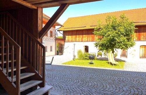 Farmhouse "Lehner im Wald". In the district of Neudorf 4 km from the centre of Rutzenmoos, in a secluded position. For shared use: property with meadow. Terrace, garden furniture, barbecue, planted inner courtyard. 1.2 km long bumpy motor access to the house. Shop 1.5 km, supermarket 5 km, bus stop "Pinsdorf" 7.4 km, railway station "Pinsdorf" 7.4 km, outdoor swimming pool 3 km. Golf course (18 hole) 2 km. Local sale of farm products.
