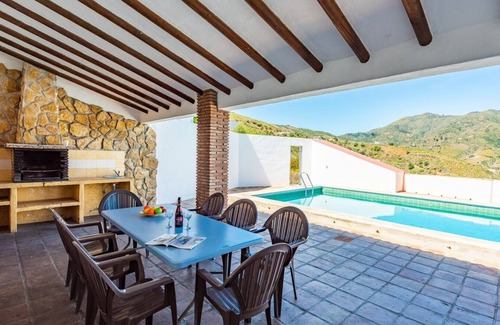outside, you will find the swimming pool and a barbecue From the spacious terraces, splendid mountain views will delight your eyes, as you try to spot the several villages of the Axarquía. The pool is provided with a temporary, 2-mt-high fence for the winter months, while open from the end of April to the end of September. However, please check with a booking agent if the pool is available during your stay.
