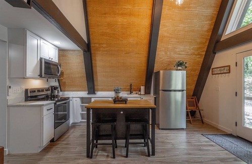Take it easy at this unique and tranquil getaway. Conveniently located close to downtown Chattanooga, but far enough away to enjoy the woodsy relaxing treehouse feel in this super unique A-Frame cabin! Only 5 miles from downtown Chattanooga and 5 minutes from the Chickamauga Battlefield! The Linden A Frame is a NEW beautiful and unique 1 bedroom 1 bath cabin. It has a full kitchen, full size fridge, range, microwave and all of the cooking essentials needed for your stay! It offers the perfect outdoor space on the back deck overlooking the woods! Perfect for relaxing under the string lights. The living room is open and spacious, and has a remote operated projection screen perfect for movie night! The stairwell ladder will take you up to the sleeping loft with a queen sized bed and a large window, looking out into the trees..