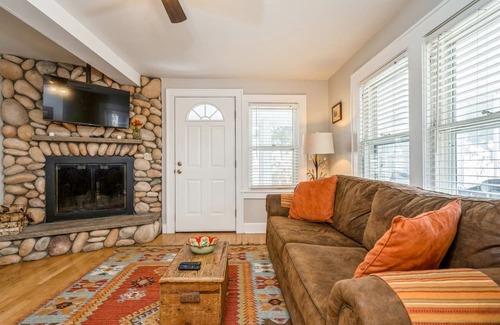 open concept first floor living with kitchen, full bath, laundry and a lovely stone fireplace to sit around