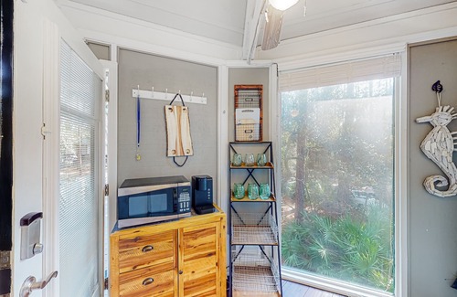 the home’s unique layout creates a flow from room to room that cannot be matched The open-air kitchen is equipped with all you need to prepare home-cooked meals or snacks for the beach. A leather sofa and a smart TV welcome casual downtime and movie nights in the living room. Free WiFi, streaming, central air-conditioning, and a private washer/dryer. Rest in the rocking chairs or take a bike ride around the island and stop at the nearby waterfront QuarterDeck for fresh southern cuisine at the base of the Harbour Town Lighthouse. it’s all waiting for you!