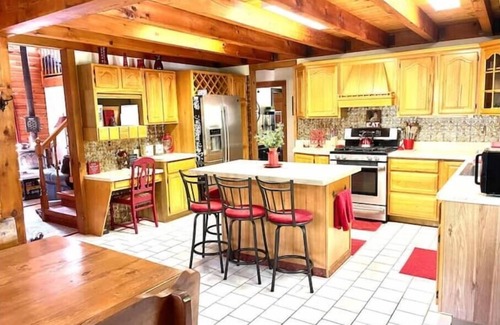 there is a fully serviced kitchen on the main floor, which is a wonderful space to gather Your friends and family can sit around a central island that seats four for cooking together, chatting and sharing appetizers. There is also a large table where you can sit down for a meal and enjoy a view of the beautiful field below. Often, you will be greeted by deer in the early mornings and at dusk.