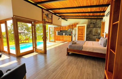the love nest loft is a beautiful contemporary style small house with a spectacular 180 degree view of the pacific coast in the heart of the jungle in uvita, costa rica It will charm you with its touches that are both exotic and modern. This house, which can accommodate 2 people, has everything to please you. This property contains 1 bedroom, 1 bathroom, 1 terrace with sea view and a private outdoor swimming pool. Prepare a delicious home-cooked meal in the open-plan kitchen equipped with everything you need. This dining room is equipped with a stove, a refrigerator all in stainless steel and also a coffee maker, a microwave and kitchen utensils. You will also find a common area lounge where you can relax in complete simplicity with television, wifi while observing this nature in harmony with the Ocean.