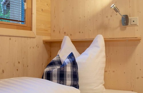 "glamping lodge a", 2-room mobile home 33 m2 Object suitable for 2 adults + 2 children. Cosy and wooden furniture furnishings: living/dining room with dining table, kitchen corner and satellite TV (flat screen). Exit to the terrace. 1 double bedroom. Gallery with 1 double bed. Kitchenette (oven, dishwasher, 2 ceramic glass hob hotplates, kettle, electric coffee machine). Shower/WC. Heating. Parquet floors. Terrace furniture. Facilities: hair dryer. Internet (WiFi, free). Please note: non-smokers only. Guests have free access to the nearby See-Areal lido in Steindorf. Instead of an enclosed bedroom, some sleeping areas are located in an open-plan area (gallery, alcove, etc.).