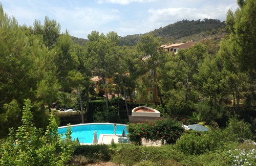 apartment info: spacious, sunny, west-facing terrace with lovely view of pools and forested hills in distance (accessed off the living area via lockable doors) has dining furniture for 4 & 2 loungers Beautiful shared gardens, an adult and separate children's pool, with loungers & parasols. Pools maintained daily. Shower and toilet facilities adjoin the pools. Allocated parking space.