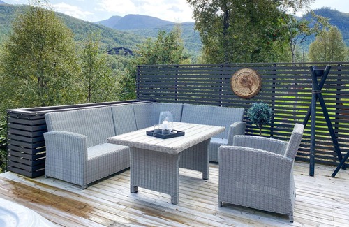 look forward to this fantastic vacation idyll near stordal and make this cozy cottage your home In the high-quality interior, you can cozy up in the evenings with a fireplace and entertaining movie and before that enjoy the view in the hot tub and barbecues on the terrace. You can start your mornings with a daily outdoor shower before gathering around the dining table for breakfast.