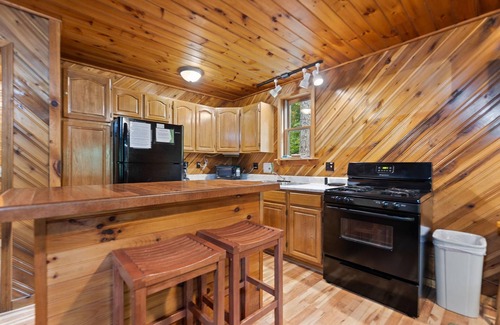 Located in Cliffview resort and nestled deep in the woods, this lovely 2-BR, 1-BA Cabin features fiber optic Wi-Fi, hot tub with room for 5, gas fireplace, and Smart TV with satellite TV sleeps 4. Overlooks a fishing pond and has a view of cliffs in the background.