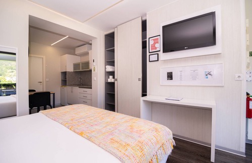 Bottom floor Studio, it features direct view and access to the garden and a private balcony where you can sit down and relax, read your favorite book, enjoy your morning coffee and even perhaps eat while you listen to the birds sing. In the kitchenett inside the studio you can prepare your meals your own way, and there is also an outdoor BBQ that anyone is free to use. Every Studio has its own private Kitchen and bathroom. We look forwad to welcome you and provide confort in your adventures..