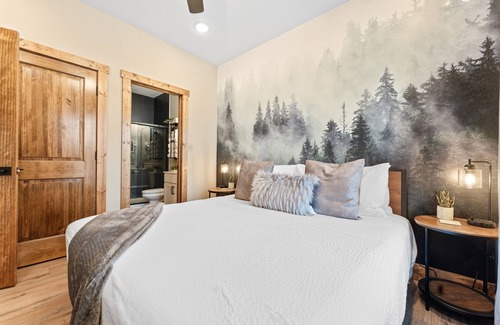 our five-bedroom cabin, each room complete with a private bathroom, comfortably sleeps a larger group We offer three bedrooms with king-sized beds, one bedroom with a queen bed and two twins, and a bunk room designed to accommodate three. The solid bunk beds are sturdy, each capable of supporting up to 400 lbs per twin bed. For large groups up to 16, we also provide queen sleeper sofas in the living areas, furnished with all necessary linens and blankets.