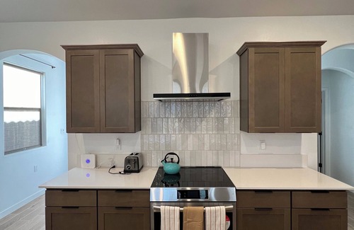 Welcome to our spacious 3BR/3BA home, perfect for your next getaway. This brand new urban retreat in Bakersfield offers a serene escape for you and your travel companions. Each bedroom is designed with your comfort in mind, featuring cozy king and queen sized beds and ample storage space. Relax in the modern bathrooms, each equipped with fresh towels, essential toiletries, and either a bathtub or walk-in shower.