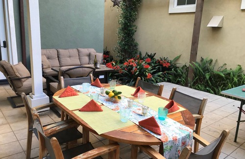 Our stunning 4 Bedroom, 3.5 bathroom home built in 2004, offers a perfect blend of comfort and style for up to 8 guests. With spacious 10 ft ceilings, french doors, balconies, 3 cozy fire places, our home exudes warmth and charm throughout. Our spacious courtyard features a large in-ground jacuzzi, firepit with comfortable seating, a built-in barbeque, dining area and a ping pong table. In addition to these many amenities and proximity to Windansea Beach, you will find several grocery stores and dining options a short walk away.