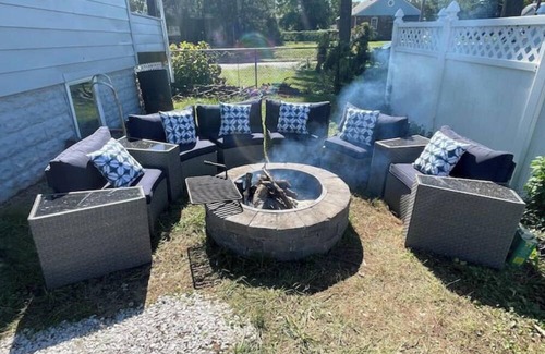 relax by the stone fire pit 🔥 or enjoy the bluetooth music vanity mirrors and wall-mounted smart tvs throughout the house