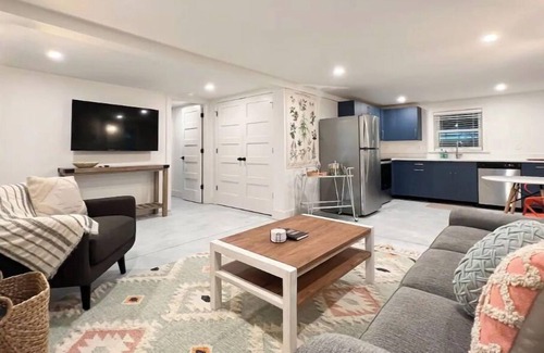 this spacious 650-square-foot guest suite features a separate bedroom with a king-size bed, a cozy sitting area with a 55" tv, high-speed wifi with an extender, and a 4k apple tv ready for your subscriptions and streaming The fully equipped kitchen includes high-quality cookware, utensils, appliances, and bar essentials.