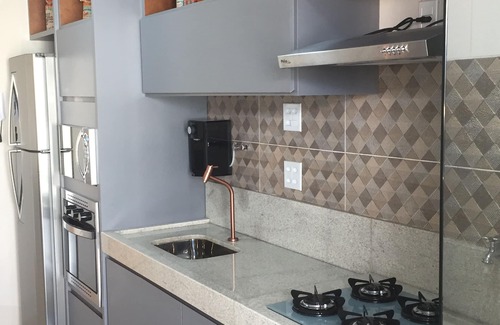 kitchen american type: integrated with the living room, our kitchen was all assembled with new appliances such as: cooktop stove, scrubber, electric oven, water filter, refrigerator, microwave, sandwich maker and blender The kitchen has been fitted with custom cabinets and has all the necessary utensils for the preparation of meals, such as a pan set, plates, glasses, bowls, cutlery, etc.
