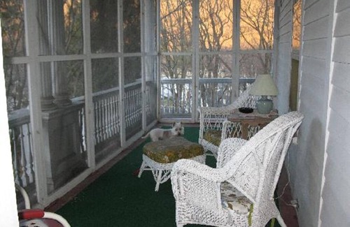 With its own private screened-in veranda, the Mandeville is one of our most popular rooms. It has a queen-sized bed with a private bath inside the room, and an oval-shaped stained-glass window above the bed. The Mandeville is located on the second floor..
