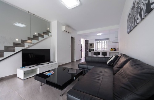 Modern and completely refurbished duplex located next to the beach of Meloneras. It has two spacious terraces and balcony, 2 bedrooms, 2 bathrooms, a private pool and a communal pool.The house is located in the exclusive 5 star hotel area of Maspalomas/Meloneras and close to high class restaurants. The beach of Maspalomas is within walking distance and the beach of Meloneras is only 150 metres from the flat.The house is distributed over two floors: - On the main floor there is the entrance, the living room-kitchen, a bathroom with shower, the main terrace with private pool, 2 sun loungers, a chill-out area with sofas, and another outdoor terrace with barbecue and dining table. The kitchen is fully equipped, with dishwasher, washing machine, kitchen utensils....- On the upper floor there is 1 bedroom with two single beds, 1 bedroom with double bed and balcony and 1 bathroom with shower. In all rooms there is smart-TV, air conditioning and free high speed wifi. The bungalow can be enjoyed both inside and outside all year round, as it offers all the comfort you would expect.The back patio gives access to the communal areas, as well as to the wonderful communal pool, absolutely recommended to visit and enjoy.Cots and high chairs are available. Please let us know when booking. Cot and high chair will be provided on request only.Discounts are available at the Salobre Golf Resort and Anfi Tauro Golf courses.I will be available to help you, recommend the best places on the island and enjoy your holiday in my tropical paradise.From the house you can walk to the lighthouse of Maspalomas along the wonderful promenade of Las Meloneras, where you will find the best restaurants in the south of Gran Canaria. There is a supermarket just a few minutes walk away.In front of the flat there is free parking available at all times. This property is located in a residential area, therefore any activity that may disturb other guests or neighbours is strictly forbidden.SURROUNDINGS- Shopping centre: 300 m- Restaurant: 300 m- Beach: 600 m- Supermarket: 700 m- Hospital: 700 m- Shopping: 2 km- Maspalomas lighthouse: 2.6 km- Maspalomas Dunes: 3 km- Golf course: 3,6 km- Marina: 3,8 km- Airport: 37 km.