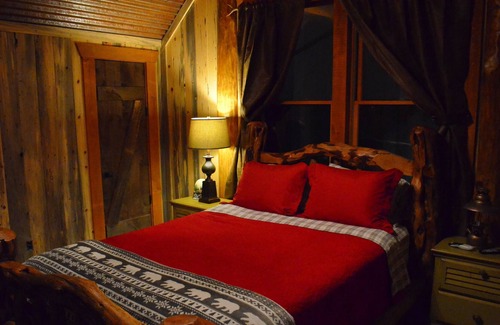 a 2nd bedroom on the first floor has a queen bed and an adjacent full bath Upstairs there is a 3rd bedroom with a queen bed. Also on the second floor is an oversized bedroom that sleeps 8 with a king bed and a set of custom log bunk beds (2 double beds and 2 twin beds).