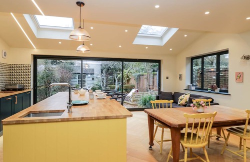 amenities: air-source heat pump Electric oven, induction hob, microwave, fridge/freezer, washing machine, tumble dryer, dishwasher. Smart TV, WiFi, selection of books. Fuel, power, and starter pack for woodburning stove inc. in rent. Bed linen and towels inc. in rent. Highchair, travel cot and stairgate available. Private driveway for 2 cars. Enclosed rear garden with lawn, patio, furniture, shed, children's play area, and stream. Sorry, no pets and no smoking. Shop and pub 0.1 miles, Bourne Rivulet 0.6 miles. Note: There are steps to the exterior of the property. note: whilst the stream is shallow, please ensure that children are supervised at all times
