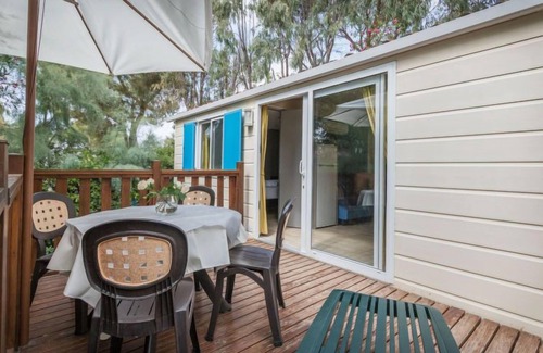 3-room mobile home 30 m2, on the ground floor Practical furnishings: living/dining room with satellite TV. 1 double bedroom with shower/WC. 1 room with 2 beds. Kitchenette (Gas stove, 4 gas rings, kettle, electric coffee machine). Shower/bidet/WC. Electric heating, air-conditioning. Small terrace. Terrace furniture. Facilities: Internet (WiFi, free). Parking (1 car) at 100 m. it049009b1gp3n4t2t
