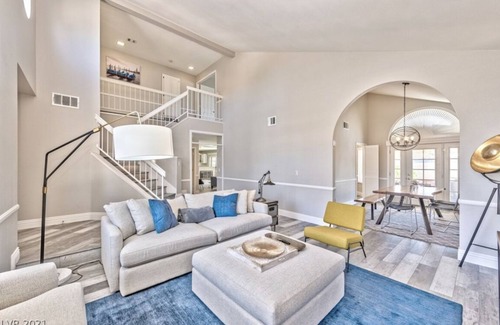 Highly upgraded home in the Lakes with a pool situated on a corner lot. Upgrades include new flooring, quartz counters in the kitchen and bathrooms, new tile backsplash, stainless steel appliances, tile in showers, and more. The large primary bedroom has a large walk in shower and ample closet space. The secondary bedrooms and bathrooms are all remodeled as well. This home is perfect for families or any working professionals looking for more space. Home is walking distance from the lakes, close to the 215, and downtown Summerlin is less than 10 minutes away.