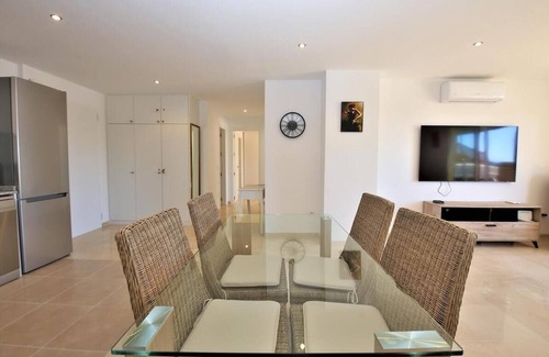 A modern, south facing front line apartment that has been completely renovated in a high standard and quality. The spacious property offers two large bedrooms and two bathrooms. The master bedroom has a super king size bed and air conditioning with direct access to the balcony with an outdoor dining area. It has an en-suite bathroom with walk-in shower, WC and sink. It also offers plenty of storage space in its built-in wardrobes. The second bedroom has two single beds and it is also equipped with air conditioning and built-in wardrobes. There is a family bathroom in the main hallway with shower, WC and sink. The modern lounge is very bright and offers comfortable seating for four guests along with a Wifi internet connection and international TV including Sky. The property has a modern open kitchen with all the appliances you may need for your holiday. Parking is possible in the communal parking area and operates on a first come, first served basis however finding a space isn't normally a problem. You can also park nearby for free and the property would suit families, golfers and retirees in particular. To reach this property you must go up a flight of around 15 steps from the port entrance..