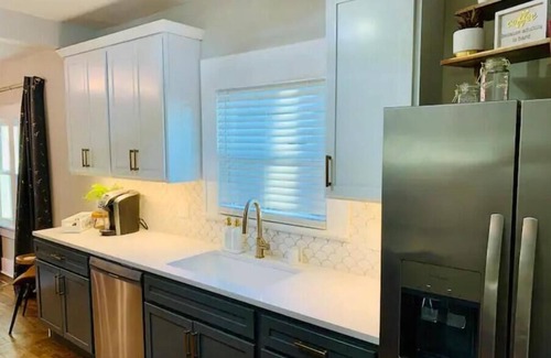 No cleaning fees! Enjoy a stylish experience at this prime location in the Delano District, across the street from Riverfront Stadium and the Wichita Ice Center and only 4 minutes to Intrust Bank Arena and Old Town. This 1918 craftsman bungalow has been completely remodeled with upscale finishes, yet still maintains its original charm. The home features 3 bedrooms and 2 bathrooms, glam kitchen, laundry room and workspace. Relax with a drink on the charming front porch or back deck. we are experienced superhosts!