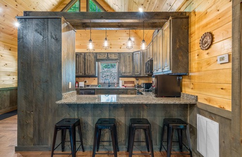 the secluded cabin has vaulted ceilings and an all-wood interior that will make you feel right at home The full kitchen is equipped with stainless steel appliances and plenty of granite counter space for you to cook up a storm. There is also a private hot tub, private washer/dryer, and central air-conditioning for your convenience. The gas fireplace will keep you cozy and warm throughout the winter, and the private gas grill will make for some fun warm-weather barbecues in the summer months. You can enjoy the beautiful outdoors from the comfy rocking chairs on the screened deck.