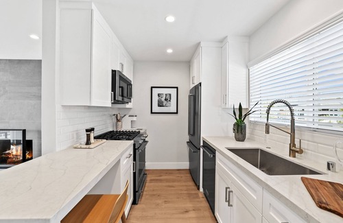 This stunning, completely remodeled 2 bedroom, 1.5 bath townhome is the epitome of modern Southern California living. Completely renovated to the studs from head to toe, including new plumbing, electrical and A/C, this home features beautiful luxury vinyl wood flooring throughout, custom built cabinetry, recessed LED lighting, designer fixtures and hardware, and peek-a-boo ocean views from the upstairs bedroom..