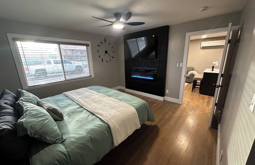 walk into the bedroom and see a king size fully ajustable bed with a simple but elegant headboard and premium sheets, with a feather down comforter for your comfort with lux pillows On each side of the bed you will have your own nightstand with wireless charging stations and charging ports located on the side.An added bonus is the 5ft electric fire place with led changing lights to fit your mood. And a 55’ smart fire tv above it, and a secure place to store valuables.
