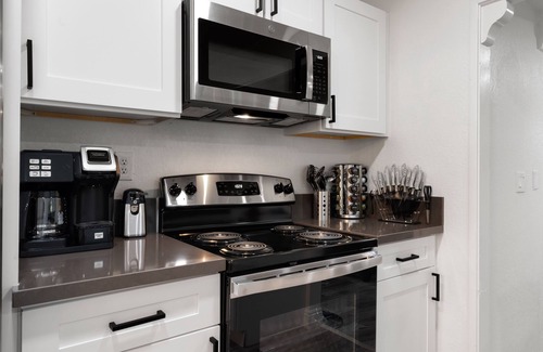 ● spacious kitchen: fully stocked with coffee maker, k-cup coffee machine, toaster, oven, microwave, fridge, dishwasher, cookware, dishes, glassware, utensils, oil, salts, and peppers with high-end stainless steel appliances
