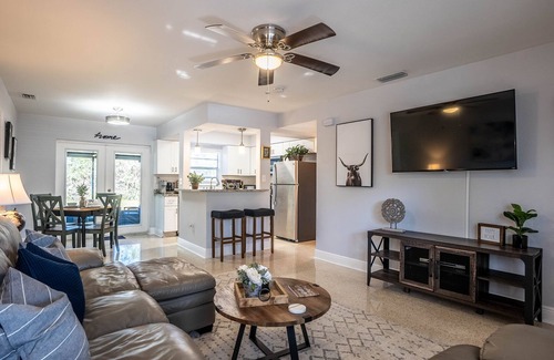 this beautifully renovated home includes amenities such as: indoor and outdoor dining, smart tv’s, fully equipped kitchen, screened-in porch, huge fenced in yard, and high speed internet Your host has paid attention to every detail of this home to create a great guest experience. Your group will find ample space for dining, with a dining table and additional bar with seating for all guests. The fully equipped kitchen includes, coffee maker, microwave, toaster, silverware, utensils and everything you’ll need to cook and prepare meals for your friends and family. The cozy living room features a smart TV with your favorite streaming services available. The master bedroom features a queen-sized bed and smart TV. In the remaining two bedrooms you’ll find cozy queen-sized beds. All bedrooms have plenty of space for storage. The relaxing yard area creates a Zen mood with its beautiful nature environment. Your large group can relax outside, cook dinner and then dine with a tropical view, in the privacy of this beautiful home.