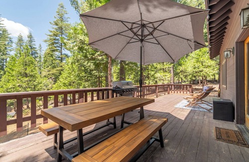 Welcome to Mojave Vista, a stunning clerestory cabin in Big Trees Village with free access to the Big Trees Village HOA recreation center (with 2 pools, games, snack bar, sand volleyball, horseshoes, playground and more)! You’ll also enjoy being close to our area's best local attractions including Bear Valley Ski Resort, Calaveras Big Trees State Park, Lake Alpine, The Arnold Rim Trail, and the towns of Arnold and Murphys for shopping and dining! This lovely 2-story retreat is located in Camp Connell with 3 bedrooms, 2 full bathrooms, a loft, and a spacious deck to relax and recharge! The living area has that mountain feel with beamed ceilings and a cozy gas log stove. Adjacent is the spacious dining area and fully stocked kitchen, ready to whip up delicious mountain meals! One bedroom and bathroom are on the main level while you’ll find the loft, 2 remaining bedrooms, and the second full bathroom with sauna located upstairs. the driveway provides plenty of parking and features a tesla charger! your pets are welcome at this cabin (max 2) so you can have a memorable getaway with the whole family included!