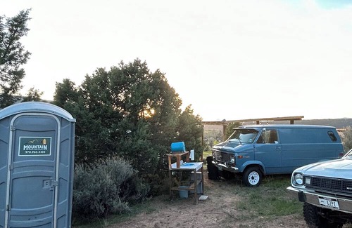 we have the 1970's shaggin' good times van - the van d' glamp with a private covered deck, solar power generator, and campfire pit and grill We also have the 1980's Wilderness 16' Camper (The Glamper) with a working refrigerator and freezer, sink, coffee maker, and microwave.