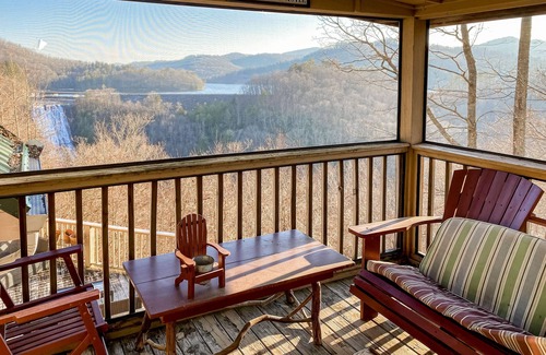 a wilderness retreat you won't forget is awaiting at high falls! enjoy stunning year-round views of lake glenville from the expansive back deck This cliffside home is named for High Falls, a beautiful local waterfall accessible via a trail from the nearby Pines Recreation area. The Pines is a small public access park about a mile from the home with picnic tables, seasonal restrooms, and a public swimming beach right on Lake Glenville. It's perfect for an afternoon excursion! The lake view is constant, and lucky guests will also enjoy intermittent spillway waterfall views from the home. Called Onion Falls, this bonus waterfall forms when extra water is released over the dam spillway from Lake Glenville into the West Fork Tuckasegee River below.