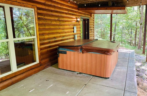 Easy access, private 3 story log cabin with lake and dock. Bedroom and full bath on each floor, loft with loveseat sleeper and tv, and sleeper sofa in the basement family room. Wrap around covered porch. 3 fireplaces, one on a screened deck with lake views, one inside, and a gas one in the basement family room. Family room downstairs with game room, bar, gas fireplace, and hot tub on rear patio. Fire pit area, and stairs all the way to the lake. Enjoy swimming, catch and release fishing, and kayaking on the lake. 6 ponds farm, a great place for the kids, is within walking distance..