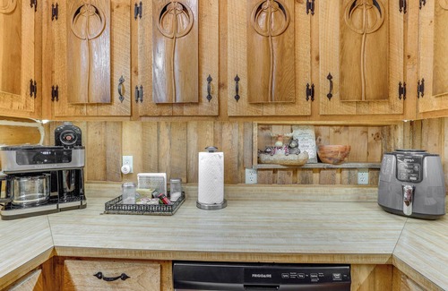 kitchen: fridge, microwave, air fryer, oven, stove, coffee maker, dishware & flatware, spices