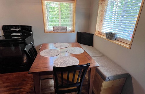 Relax with your family & friends in this peaceful cabin at Nolin lake. We are located past the Ponderosa Marina turn off on a private road. Our home has been completely remodeled with some finishing touches still being completed but we are ready to share it and for you to enjoy it. You can relax and truly enjoy nature from almost any view. You can access the lake via a short walk so bring your rafts, sunscreen and picnic basket. Our home has a private drive with steps down to a beautiful front deck. When you enter the front door experience an open floor plan. Our living room offers plenty of seating to kick back and relax. The kitchen has everything you will need to enjoy home cooked meals with a built in bench surrounded by windows to watch the wild life off the back deck. We have 2 bedrooms - one with a queen bed and the other has a queen bunk bed w/ twin on top. The bathroom has a shower w/ bench, fresh towels, soap, body wash, shampoo, conditioner and tp provided. There is a side door out to a deck that wraps around the back of home to truly enjoy mother nature. A very peaceful setting w/ outdoor furniture to sit and enjoy. We offer a gas grill and firepit for those campfire nights..