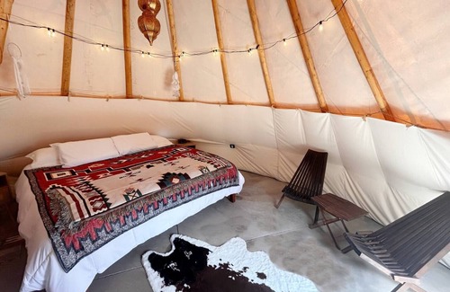 Experience a unique blend of tradition & modern luxury in our custom-built Native American tipi. Enjoy nature's serenity while indulging in modern comforts: king-sized bed, kitchenette, & climate control. This tipi combines charm of the past with comforts of today, creating an unforgettable stay. Whether seeking adventure or relaxation, our tipi provides a connection to nature within an unforgettable get-away. It's glamping at its finest, offering a serene, authentic, & luxurious escape..
