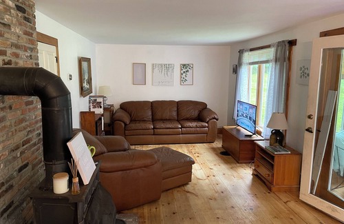 inside, you'll find a cozy yet spacious layout, with rustic pine floors throughout and large windows that flood the rooms with natural light The open dining and living room areas are perfect for relaxing or entertaining, while two wood stoves provide warmth and comfort on cooler evenings. The all-season sunroom invites you to enjoy the surrounding views year-round, whether you’re watching the seasons change or catching the summer breeze.