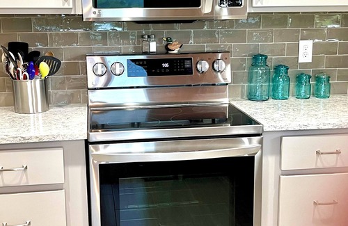 the middle floor has two bedrooms, a bath with soaking tub and shower, and high kohler toilet, living room, dining area and kitchen The open living room has a stacked stone gas fireplace with a timer/thermostat which is very easy to operate. Wood floors and soaring tongue and groove ceilings add to the warmth. The well-supplied kitchen has quartz countertops and stainless steel appliances, including a French door refrigerator with icemaker, a convection and air fryer stove, over-the-stove microwave and dishwasher. The dining table easily seats eight, and the barstools and bar are convenient for quick meals. This floor leads to two decks: a covered area with a six-foot cedar swing, dining table and chairs; the other with chaise lounges and a gas grill.. Bird feeders attract many colorful birds and hummingbirds, which provide hours of entertainment.