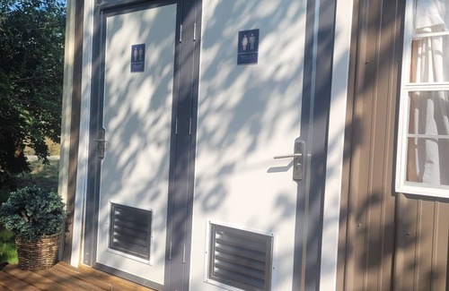 offers a classic bunkhouse experience, with a detached, private bathhouse and