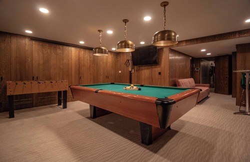 game room: arcade machines (pac-man, mortal kombat), foosball, air hockey, ping pong, and a library of games including ellenville monopoly